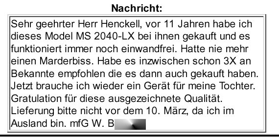 ! Wir unterstützen die deutsche Wirtschaft und fertigen in Deutschland. Wir stellen die Geräte selber her und beziehen auch die meisten Bauteile vom deutschen Markt. Wir wollen mit unseren Produkten einen Qualitätsstandard halten, der viele Jahre seinen Wert behält und Ihnen damit ein Produkt geben, das nicht billig gefertigt ist, sondern lange Jahre seinen Dienst tut, technisch sicher ist, allen europäischen Bestimmungen entspricht und trotz all dieses Aufwandes für Sie noch erschwinglich ist. Qualität hat seinen Preis.