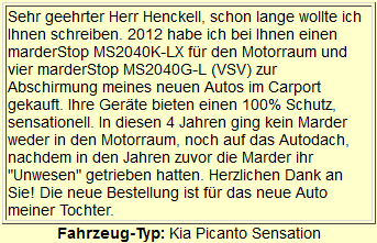 ! Berichten zufolge gehen die Marder bei unseren Geräten schreiend und schimpfend von dannen. Offenbar kreischen sie das Gerät an, das sie dauernd anbrüllt. Sie streiten mit ihm. Aber es gewinnt, weil es besser streiten kann als der nachtaktive Marder – und er zieht mit seiner Sippe aus.
